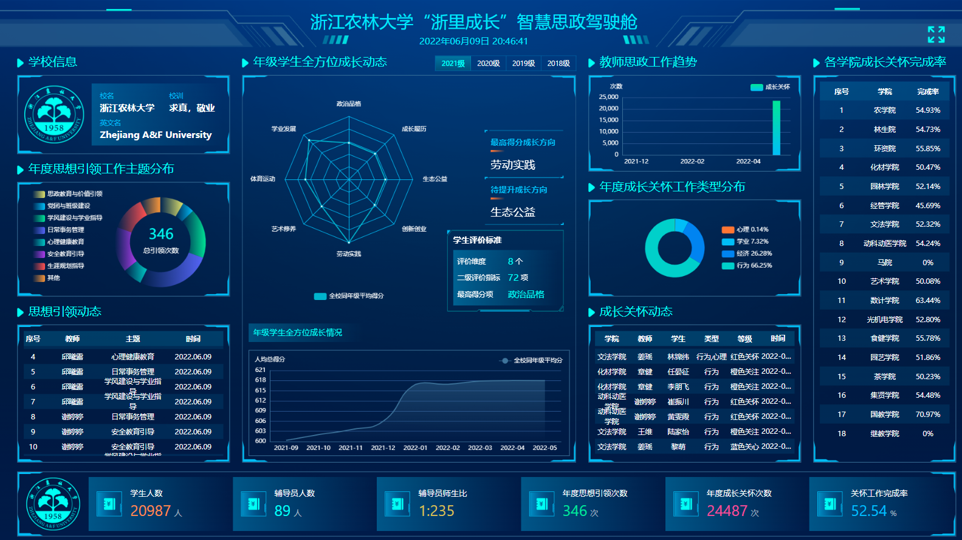 “浙里成長”智慧思政平臺在前期基礎上,不斷推進網絡思政建設,按照1+3+N架構進行系統建設,即1套學生綜合評價標準、“向陽而生”“成長關懷”“思想引領”等3個特色應用場景、N個學生評價指標,以及“浙里成長”智治駕駛艙。其中,“向陽而生”立足我校學生思想政治工作實際,打通了教務、學工、研工、人事、財務、保衛、團委、后勤等各系統間存在的數據壁壘,實現了學生成長狀態的量化評估,及時全面掌握學生的學習、生活、行為等成長狀態,提高思想政治教育的精準性,推動工作效能的提升,數字賦能思想政治工作。