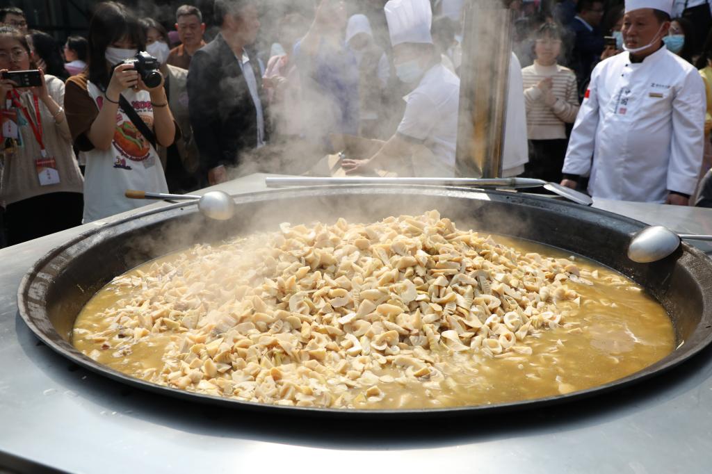 一口直徑達(dá)1.5米的超級(jí)大鐵鍋里,由1500斤春筍和300斤咸肉燉了好幾個(gè)小時(shí)的咸肉春筍熱氣騰騰,散發(fā)著濃郁的鮮香,引得排隊(duì)的師生垂涎欲滴。隨著鐵鍋的蓋子緩緩開(kāi)啟,師生人手一份,共同品嘗剛剛出鍋的咸肉春筍,感受這來(lái)自春天的味道……活動(dòng)現(xiàn)場(chǎng)熱鬧非凡,師生們熱情高漲,或在竹文化科普區(qū)駐足學(xué)習(xí),感受竹科技給生活帶來(lái)的變化,或欣賞、品嘗色香味美的各類(lèi)竹筍菜肴,或投入到樂(lè)趣十足的清明果、筍干包現(xiàn)場(chǎng)制作與師生歡樂(lè)剝筍比賽中。