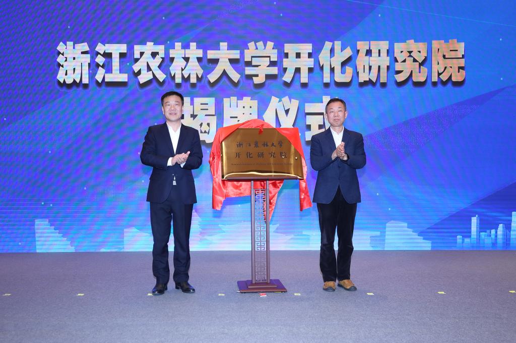 吳家勝和毛獻明共同為浙江農林大學開化研究院揭牌。開化相關負責人為研究院院長頒發聘書。開化15個鄉鎮(芹陽辦)、兩山集團與浙江農林大學16個學院(研究院) “一對一”簽約結對。