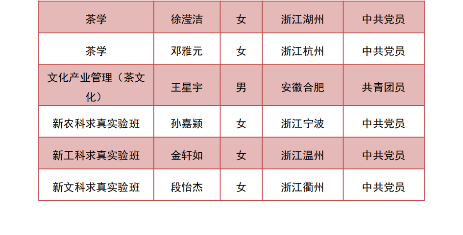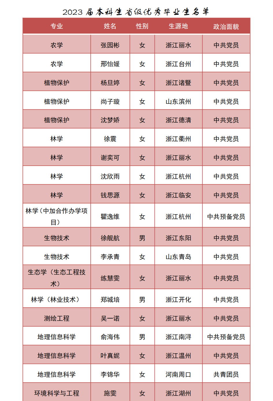 近日,浙江省教育廳辦公室公布了2023屆浙江省普通高等學校優秀畢業生評選結果。浙江農林大學共有166名本科畢業生,68名碩士畢業生,5名博士畢業生獲得“2023屆浙江省普通高等學校優秀畢業生”榮譽稱號。