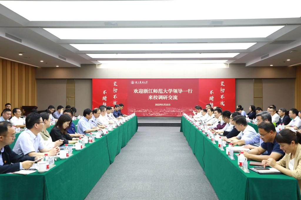 5月25日,浙江師范大學黨委書記鄭孟狀、校長蔣云良帶隊來校調研交流。校黨委書記朱斌、校長沈希出席交流座談會。浙江師范大學黨委副書記邵國平、朱堅,副校長潘慧炬、林一鋼,校黨委委員、組織部、統戰部部長呂迎春,我校黨委副書記馮尚申、施美紅,副校長沈月琴、胡祖吉、徐愛俊,紀委書記包松永,校黨委委員、組織部、統戰部部長繆魯加參加調研交流。座談會由沈希主持。