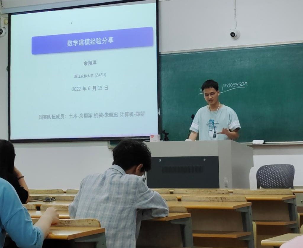 在談到過往的競賽經歷時,余翔洋說,他印象最深刻的便是數學建模競賽。在中國計量大學、浙江大學、浙江工業大學和本校四校老師的線上培訓、論文評審以及專業的數學教學之下參賽,比賽的三天里面他和隊友只睡了10個小時,老師還特意租借了一個教室讓他們單獨備賽,“我記得半夜兩三點的時候,我和我一個隊友出去聊天,發現整棟教學樓的燈都還全亮著”。這個競賽不僅大大提升了余翔洋的數學能力和編程能力,也讓他明白:在凌晨兩點和整棟教學樓一起閃閃發光的還有他們的夢想。