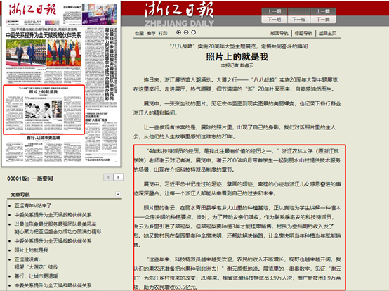 據介紹,17年前,謝云老師作為浙江省科技特派員,到麗水山村提供技術服務,一呆就是四年。當時,我校黨委宣傳部、新聞中心專門組織師生前往麗水對謝云進行采訪,并拍下這張照片。隨后,謝云的這張照片以及事跡在《浙江日報》《錢江晚報》等報刊媒體系列報道,引起全社會對科技特派員工作的關注。