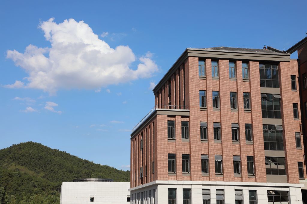 紅墻褐頂的新農科大樓在藍天白云的映襯下,