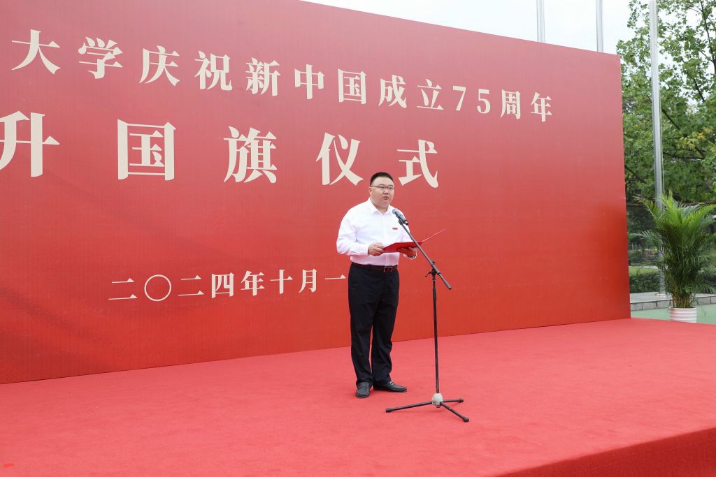 校黨委書記朱斌在國旗下發表講話,祝福偉大祖國繁榮昌盛、國泰民安。他回顧了新中國成立以來,在中國共產黨的堅強領導下,億萬中國人民團結一心,奮發圖強,書寫了國家富強、民族振興、人民幸福的壯麗史詩,以及學校與祖國同心同向、同頻共振,實現了一個又一個奮進目標的波瀾壯闊的奮斗史。