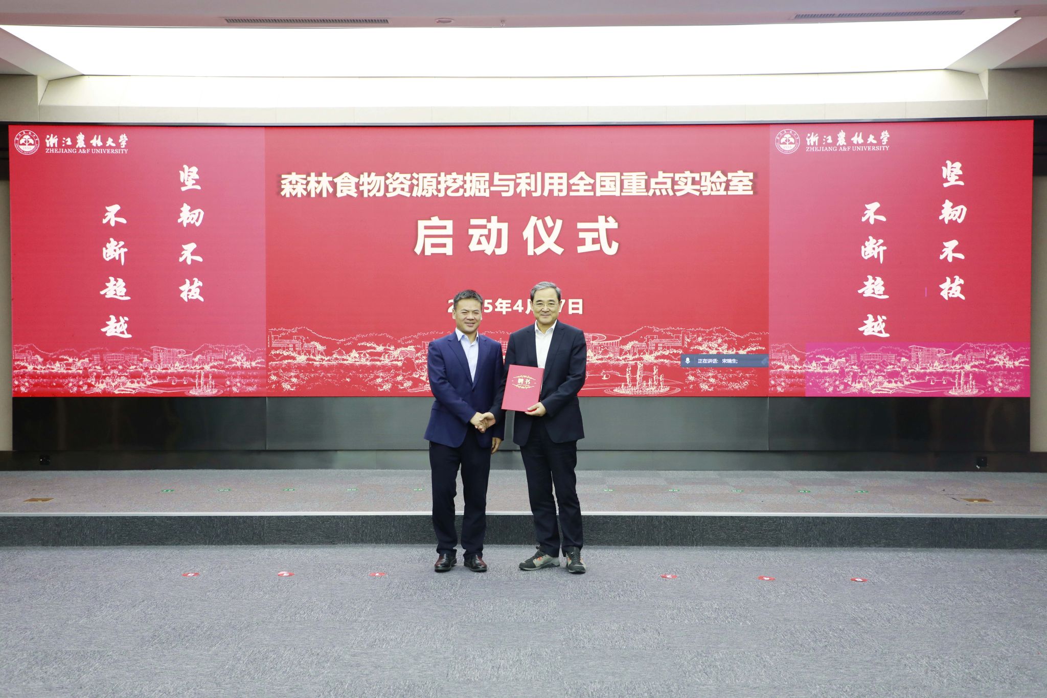 周永紅、勇強(qiáng)代表共建單位致辭。他們表示,將始終牢記服務(wù)國家戰(zhàn)略和產(chǎn)業(yè)發(fā)展的使命,充分發(fā)揮各自的優(yōu)勢,與浙江農(nóng)林大學(xué)深化合作,攜手奮進(jìn),共同解決森林食物資源挖掘與利用領(lǐng)域重大科學(xué)問題,以更高的站位、更寬的視野、更實(shí)的舉措,全力支持實(shí)驗(yàn)室的建設(shè)和發(fā)展。