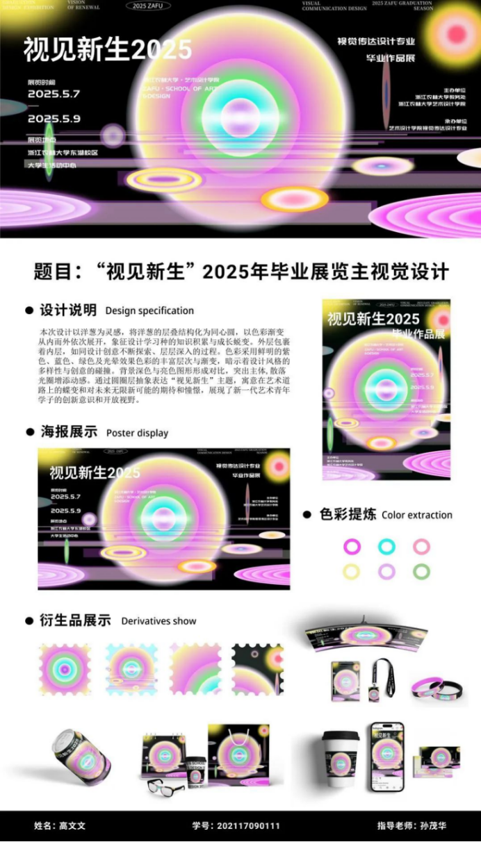 “視見新生”,寓意以全新的視角洞察世界,在傳承與創新中孕育設計新生機。“視”,代表著視覺傳達設計專業獨特的觀察與表達視角;“見”,是對社會現象、文化內涵的深度洞察;“新生”,既象征著畢業生們開啟人生新篇章,也意味著設計作品打破固有思維,呈現出煥然一新的創意與理念。