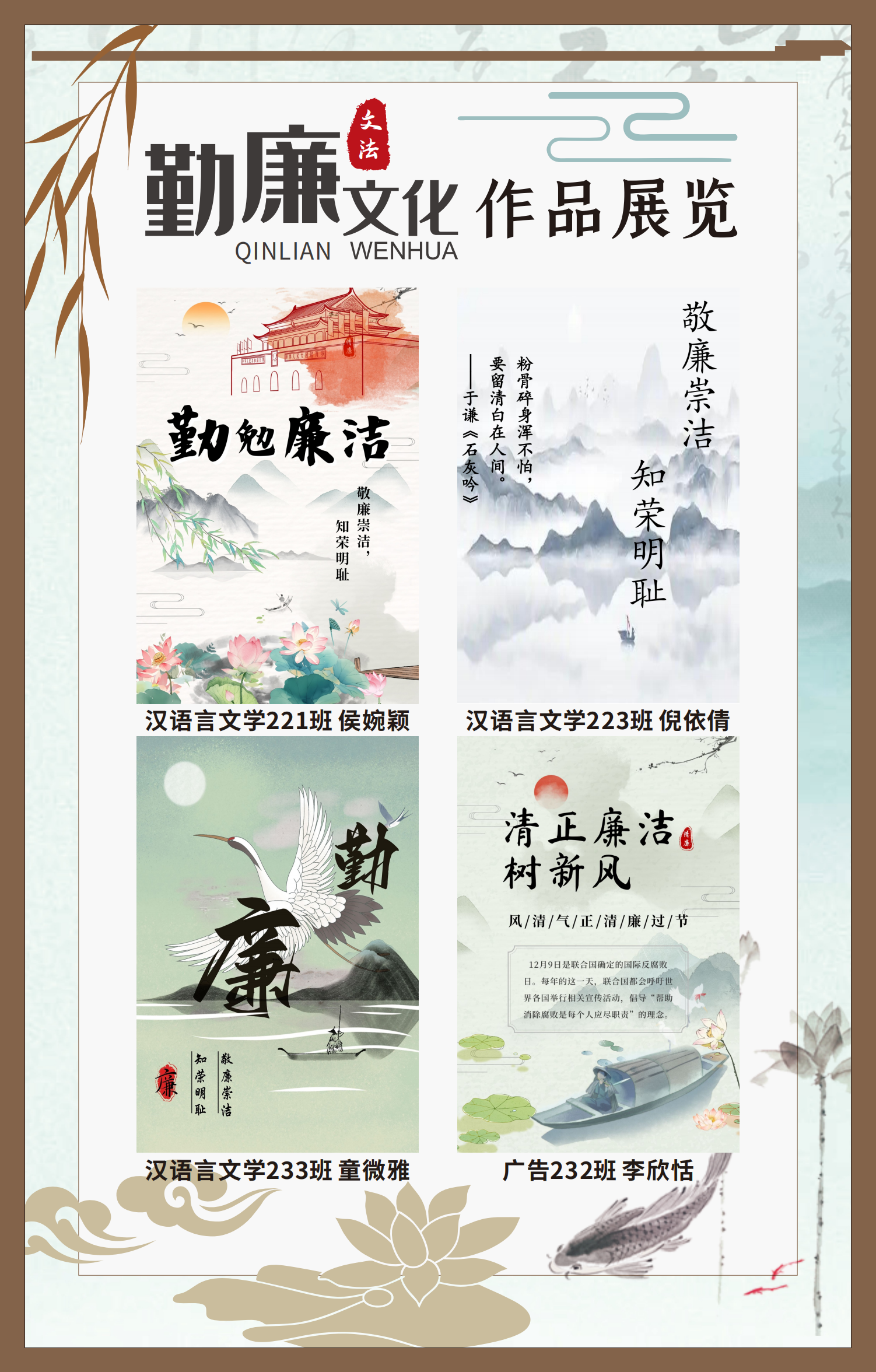 文法學(xué)院“步步生廉”文化走廊,植根于“六廉頌”清廉文化品牌,依托學(xué)院勤廉文化月活動,以師生清廉主題作品為媒介,系統(tǒng)呈現(xiàn)文法學(xué)院師生“知廉、守廉、促廉、倡廉”的實踐自覺,全景展現(xiàn)將新時代廉潔文化建設(shè)融入“立德樹人”根本任務(wù)的生動范例。