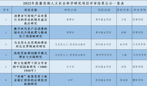 近日,2022年度教育部人文社會(huì)科學(xué)研究一般項(xiàng)目,以及高校思政課教師研究專(zhuān)項(xiàng)等評(píng)審結(jié)果相繼公示結(jié)束,我校共有6項(xiàng)項(xiàng)目獲立項(xiàng)公示,其中,一般項(xiàng)目規(guī)劃基金3項(xiàng)、青年基金2項(xiàng),高校思政課教師研究專(zhuān)項(xiàng)1項(xiàng)。在教育部人文社科一般項(xiàng)目方面,我校在全省高校中排名第10,在全國(guó)農(nóng)林高校排名第5。