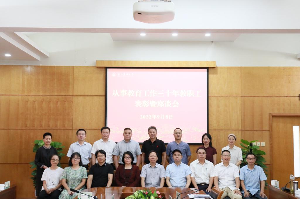 9月8日,為慶祝第38個教師節,校工會組織召開從事教育工作滿三十年教職工表彰暨座談會。會議由校黨委副書記、校工會主席馮尚申主持,宣傳部相關負責人出席,14位2022年從事教育工作滿三十年的教職工,以及來自各個學院的青年教師代表、學生代表參加座談。