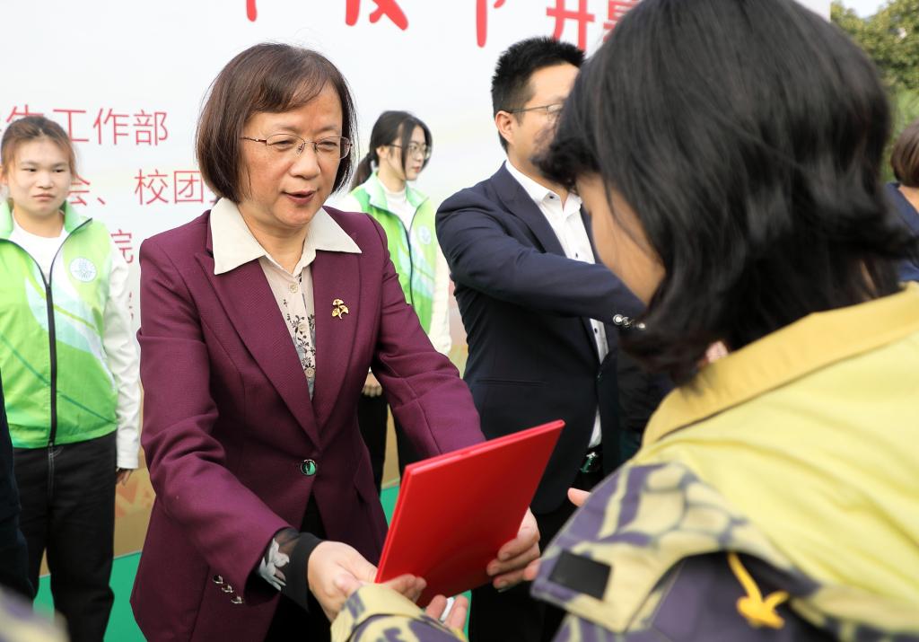 沈月琴為平山基地、百草園、農(nóng)作園、茗茶園大學(xué)生勞動實踐隊伍授旗,鼓勵大家長期扎根實踐基地,為教育部高校思想政治工作精品項目“七彩新農(nóng)人”耕讀教育實踐基地建設(shè)貢獻青春力量。