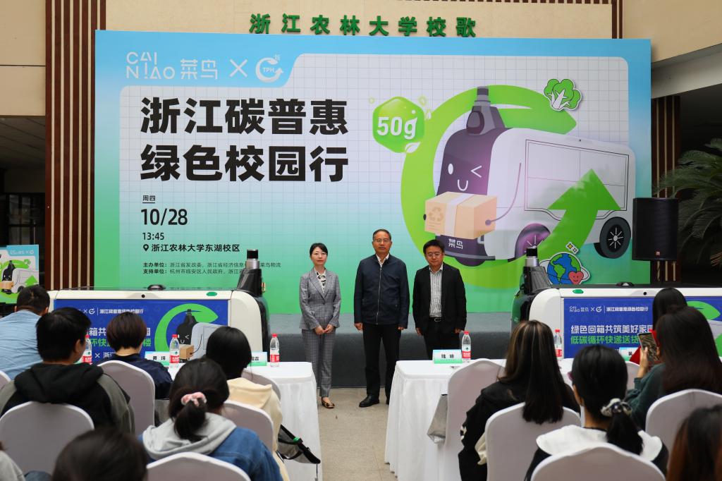 10月28日,由浙江省發改委、浙江省經濟信息中心、菜鳥物流聯合主辦的“浙江碳普惠綠色校園行”活動在我校東湖校區活動中心舉行。副校長胡祖吉,省發改委環資處處長陸瓊、省經濟信息中心能環部主任黃煒、浙能碳資產公司副總經理吳楠、菜鳥ESG副總裁牛智敬菜鳥綠色物流總經理王昊蘇、等出席活動。