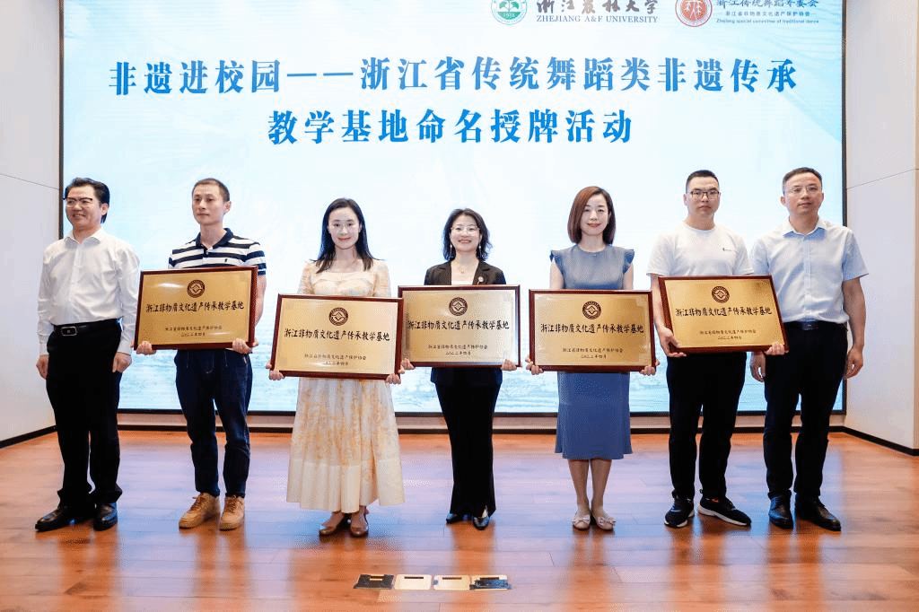 會上,葉菁向浙江農林大學贈鳴謝牌匾,胡祖吉接受贈牌。活動中,向浙江農林大學藝術教育中心等5個“浙江省傳統舞蹈類傳承教學基地”授牌;向浙江農林大學團委、藝術教育中心授予“浙江省非物質文化遺產保護協會傳統舞蹈‘兩創’優秀實踐基地”匾牌;向浙江省非遺協會傳統舞蹈專業委員會2022年“年度優秀人物”授予榮譽獎證;向首批傳承指導組、首批專家指導組成員頒發聘書;向浙江農林大學敬贈鳴謝匾牌。