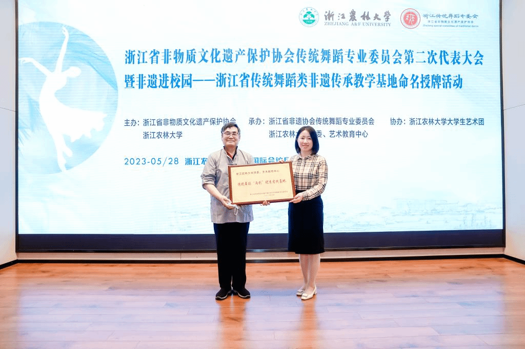 5月28日,浙江省非物質文化遺產保護協會傳統舞蹈專業委員會第二次代表大會暨非遺進校園——浙江省傳統舞蹈類非遺傳承教學基地命名授牌活動舉辦。浙江省文化和旅游廳副廳長、省非遺協會會長葉菁,浙江農林大學副校長胡祖吉,省非遺協會副會長兼秘書長、省非遺保護中心黨總支書記兼副主任吳延飛、省非遺協會傳統舞蹈專委會第一屆主任委員吳露生出席活動。