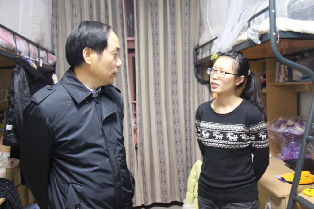 11月29日晚,校長周國模在集團總經理的陪同下,先后走訪了A3-102(聯系寢室)、103,B5-209等學生寢室,針對前期走訪中發現的問題進行回訪。經濟管理學院、公寓服務中心負責人等陪同走訪。