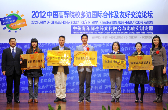 論壇期間舉行了“國(guó)際青年師生教育實(shí)訓(xùn)基地”授牌儀式,我校與北京大學(xué)、中國(guó)人民大學(xué)、北京交通大學(xué)、北京科技大學(xué)、中國(guó)石油大學(xué)(華東)、中國(guó)海洋大學(xué)、上海海洋大學(xué)、山東大學(xué)(威海)、湖南大學(xué)十所大學(xué)被中國(guó)對(duì)外友好合作服務(wù)中心授予“國(guó)際青年師生教育實(shí)訓(xùn)基地”。