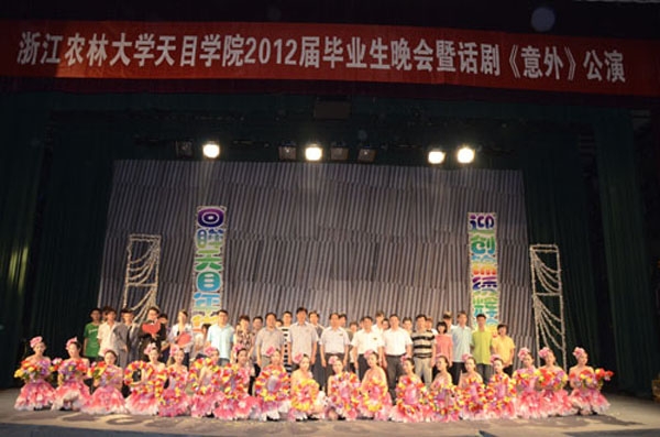 浙農林大新聞網訊 6月13日晚,天目學院“回眸天目年華·迎創錦繡輝煌”2012屆畢業生晚會暨話劇《意外》公演在東湖校區影劇院舉行。校長周國模,副校長張立欽、鮑濱福,以及校有關職能部門負責人,天目學院領導班子成員,學院各職能部門、系(部、中心)負責人及近千余名師生共同觀看晚會。