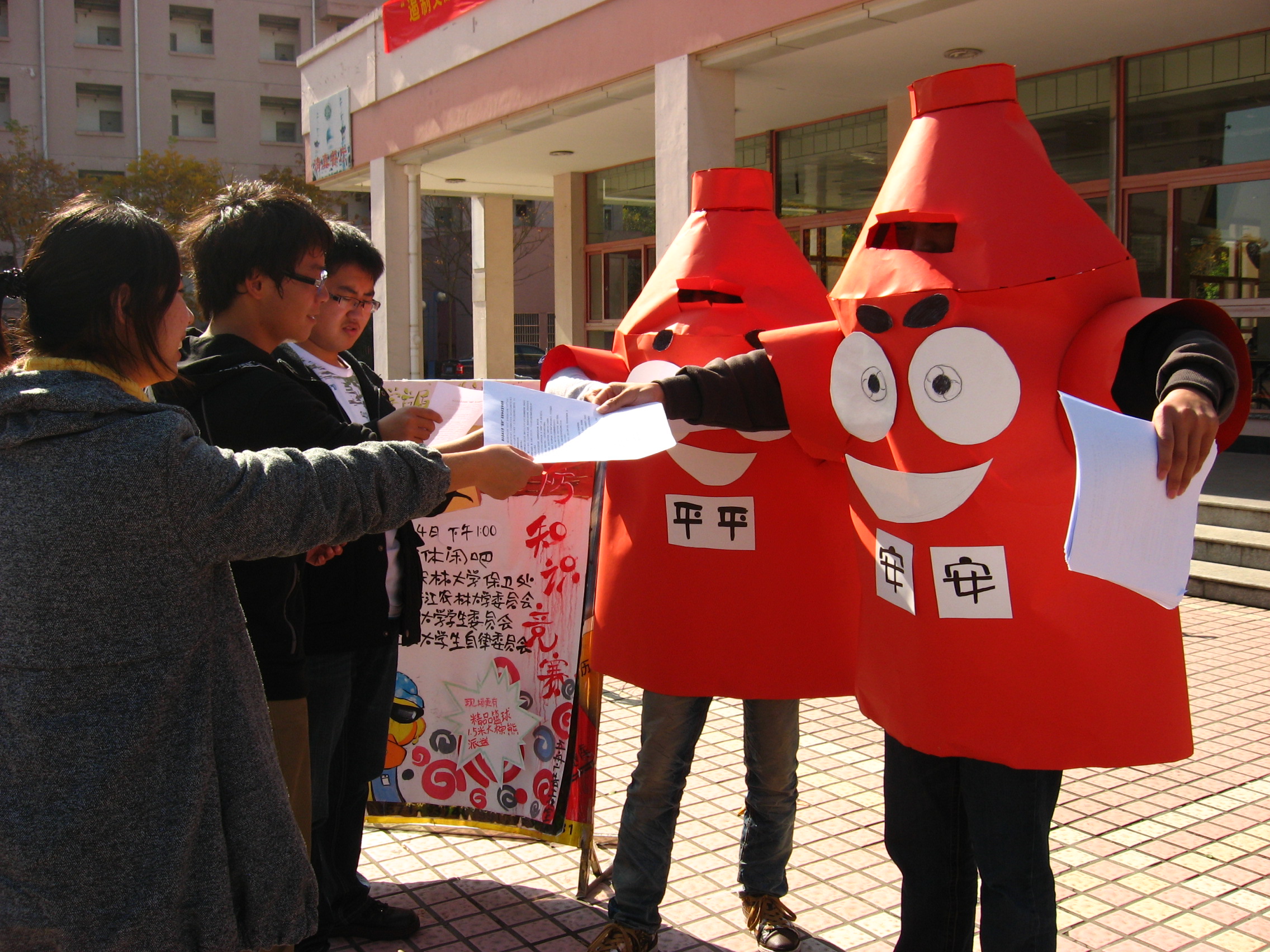 清華大學清華學堂修繕工地發生火災,上海市靜安區膠州路一高層公寓發生特大火災,浙江省也多次發生因火災引發的人員傷亡和財產重大損失事故……為了深刻汲取這些惡性火災事故的沉痛教訓,維護安定祥和的學習、生活環境,近期,校學生會校園文明督察部啟用了本屆“學生安全月”的吉祥物——“平平”和“安安”在校園內進行消防知識宣傳。宣傳內容分為校園火災觸目驚心、防火滅火小常識、火場逃生與自救三個部分。