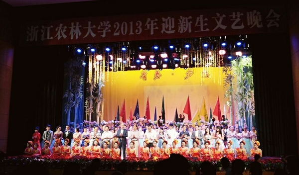 在一段包含校園風光、夢想暢談、真切寄語的視頻后,晚會拉開帷幕。開場舞《給力青春》率先將現場氣氛點燃,動感的舞步洋溢著青春的風采。各學院新生代表閃亮登場,高高揚起的旗幟,錚錚吶喊的誓言,一展新生昂揚自信的精神風貌。感人肺腑的歌曲《父親》,伴著迎新時父母接送新生的身影,使全場沉浸在濃濃的親情氛圍中。“……夢想是帆,漲滿希望之風;夢想是風,吹開希望之花;夢想是花,開出浙農林大學子最美好的青春年華。”詩朗誦《我的大學夢》,共話浙農林大新生美好而真摯的夢想。律動輕快的快板《學生手冊》告訴新生們作為一名農林大在校學生應該掌握的“應知應會”。舞臺劇《昨日重現》則以學長們的成長經歷從多角度展現了浙農林大學子的校園生活,給新生們啟迪良多。由2013級新生黃卓藝帶來的震撼人心的琵琶獨奏《十面埋伏》將晚會推向高潮。最后,晚會在一曲氣勢恢宏的大型歌舞《我的中國夢》中圓滿落幕。