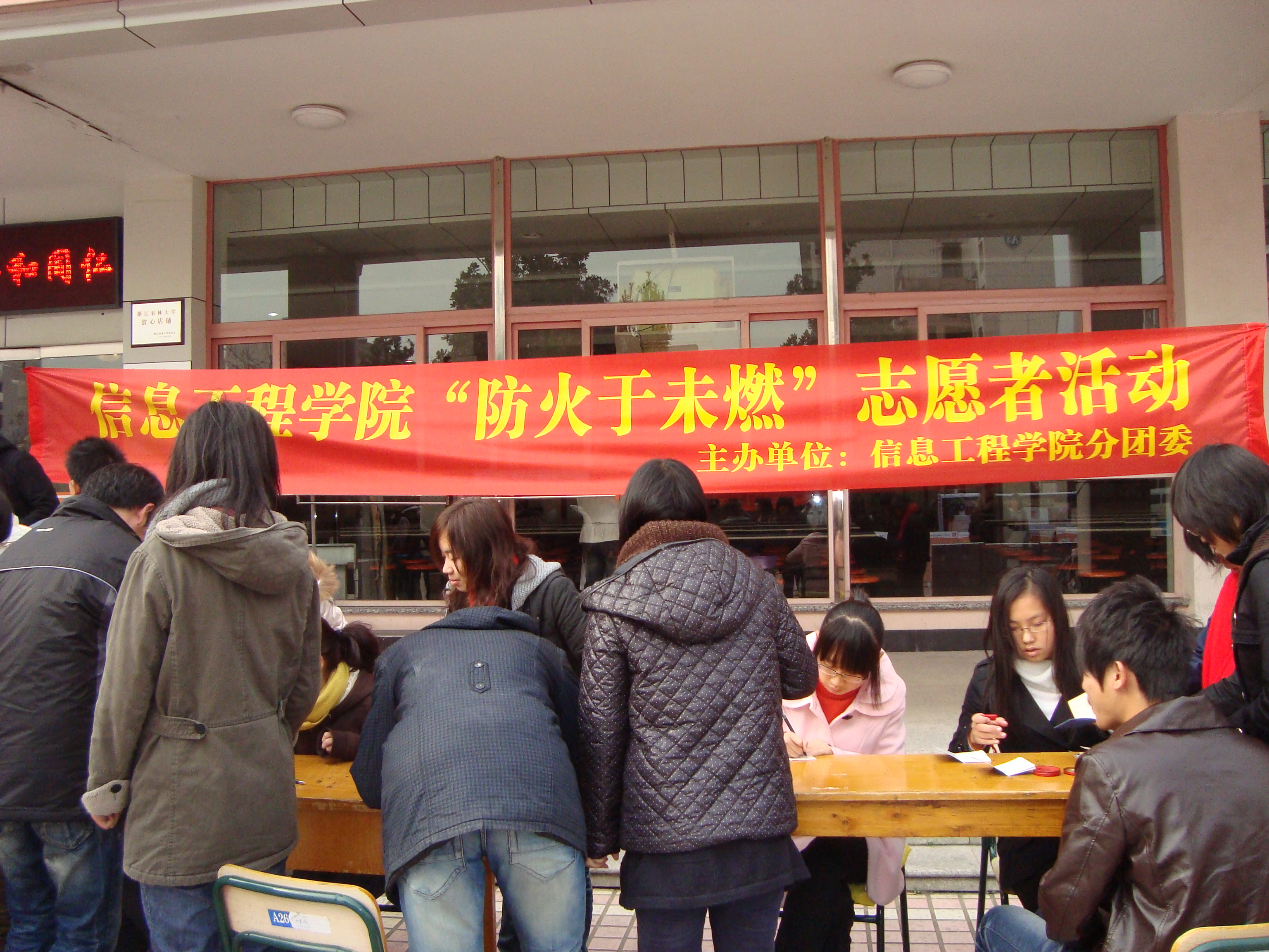 12月11日,由信息工程學院分團委組織的“防火于未燃”冬季防火宣傳志愿者活動在東湖食堂門口舉辦。由于11月份我國一些地區發生的火災釀成了不小的悲劇,此次活動引起了同學們更多的關注?;顒蝇F場展示了一些極其常見卻會給寢室生活帶來極大安全隱患的大功率電器,倡議同學們寫下承諾:不在寢室里使用熱得快、電熱水袋等存在安全隱患的電器。同學們絡繹不絕地來到現場,并在便簽紙上寫下自己的承諾,粘在活動展板上。一張張小小的便簽紙,猶如一片片葉子,在展板上組成了119,NO FIRE等字樣·····