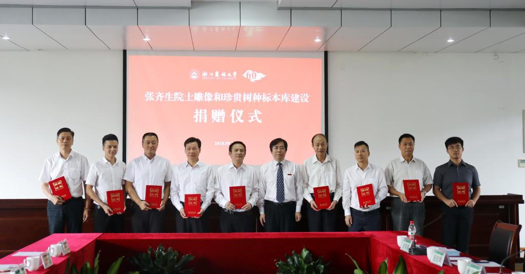標(biāo)本庫(kù)揭牌前,舉行了企業(yè)捐贈(zèng)儀式。校長(zhǎng)應(yīng)義斌向各捐贈(zèng)企業(yè)頒發(fā)捐贈(zèng)證書(shū),副校長(zhǎng)王自勇與楊洪斌簽訂珍貴木材捐贈(zèng)協(xié)議。
