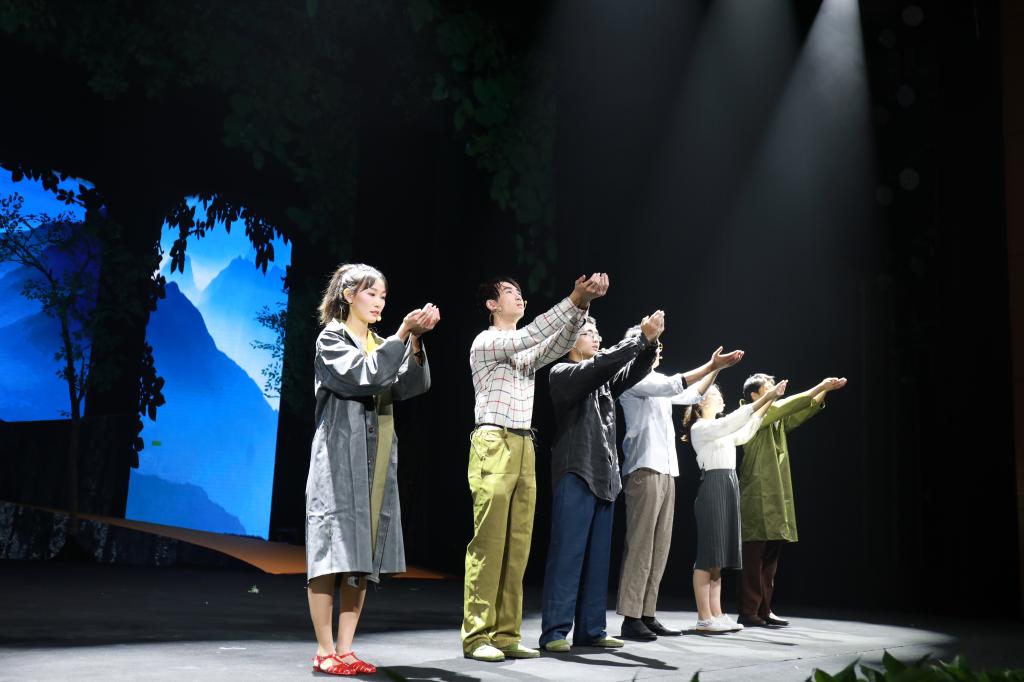 《大地戀歌》以“黨的好干部”楊東海校友,“浙江省優(yōu)秀共產(chǎn)黨員”“浙江省模范科技特派員”邵志鵬老師等為人物原型,以學(xué)校上世紀(jì)80年代以來,師生科技助力“兩山”理念發(fā)源地——安吉渾泥崗脫貧致富為故事原型,講述校友“孫大林”畢業(yè)后扎根農(nóng)村基層,一心服務(wù)“三農(nóng)”,教師“秦志鵬”犧牲在科技扶貧路上的感人故事;謳歌了一代代具有“肯干、實干、能干”品質(zhì)的浙農(nóng)林人,幾十年薪火相傳,“把荒山變青山、把青山變金山”的農(nóng)林故事。整場話劇情節(jié)跌宕起伏,高潮迭起,當(dāng)看到“秦志鵬”博士冒著大雨送香榧苗因公殉職后,他懷孕的妻子聲嘶力竭地呼喚他的名字時,現(xiàn)場許多觀眾熱淚盈眶。大幕落下,全體觀眾集體起立,向演員們的精彩演出報以經(jīng)久不息的掌聲。