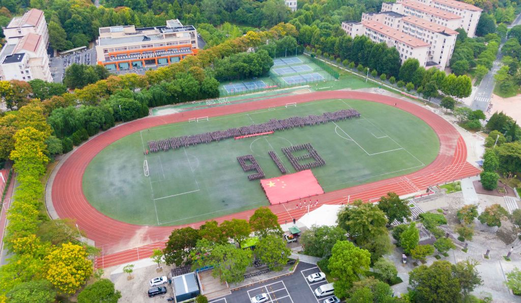 浙江農林大學新生軍訓現場,上演了精彩的朗誦節目《勿忘國恥·挺膺擔當》。隨后,200百名新生代表在軍訓教官的組織下,站成了“918”字樣的方陣,同時一面巨大的國旗在現場展開,共同表達對祖國的熱愛和對歷史的銘記。