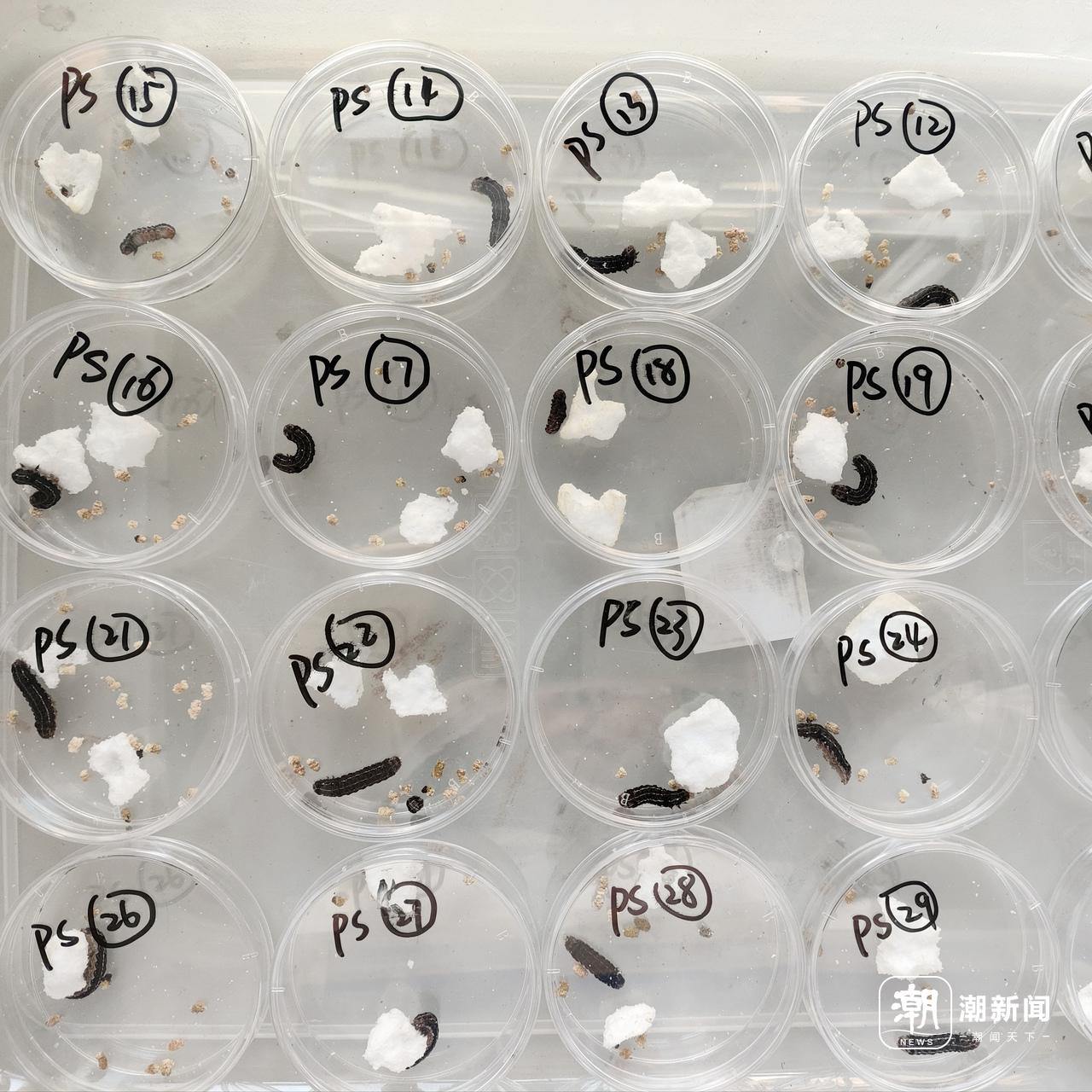 唐婭媛向記者展示了一組實驗裝置:數十個培養盒中鋪滿聚苯乙烯碎片——也就是常見的包裝泡沫。她解釋道,除了被用于包裝泡沫,聚苯乙烯還被廣泛用于農業地膜、土地改良劑、保溫膜、水培植物漂浮板等,這是日常生活中最常使用的塑料種類之一,塑料在土壤中的自然降解需數百年,而這兩種蟲子僅用幾天就能將分解。