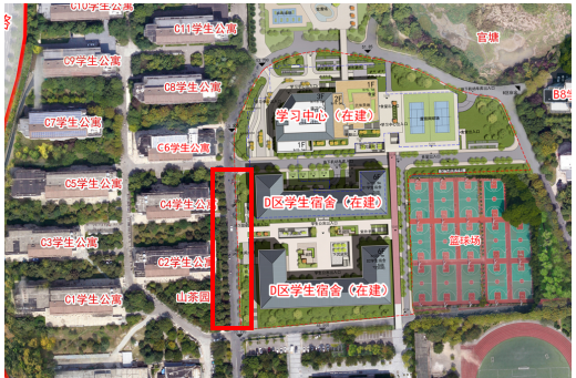 活動中心北面道路的西面路口至學(xué)生宿舍C6東面路口,具體路段詳見下圖紅框區(qū)域。