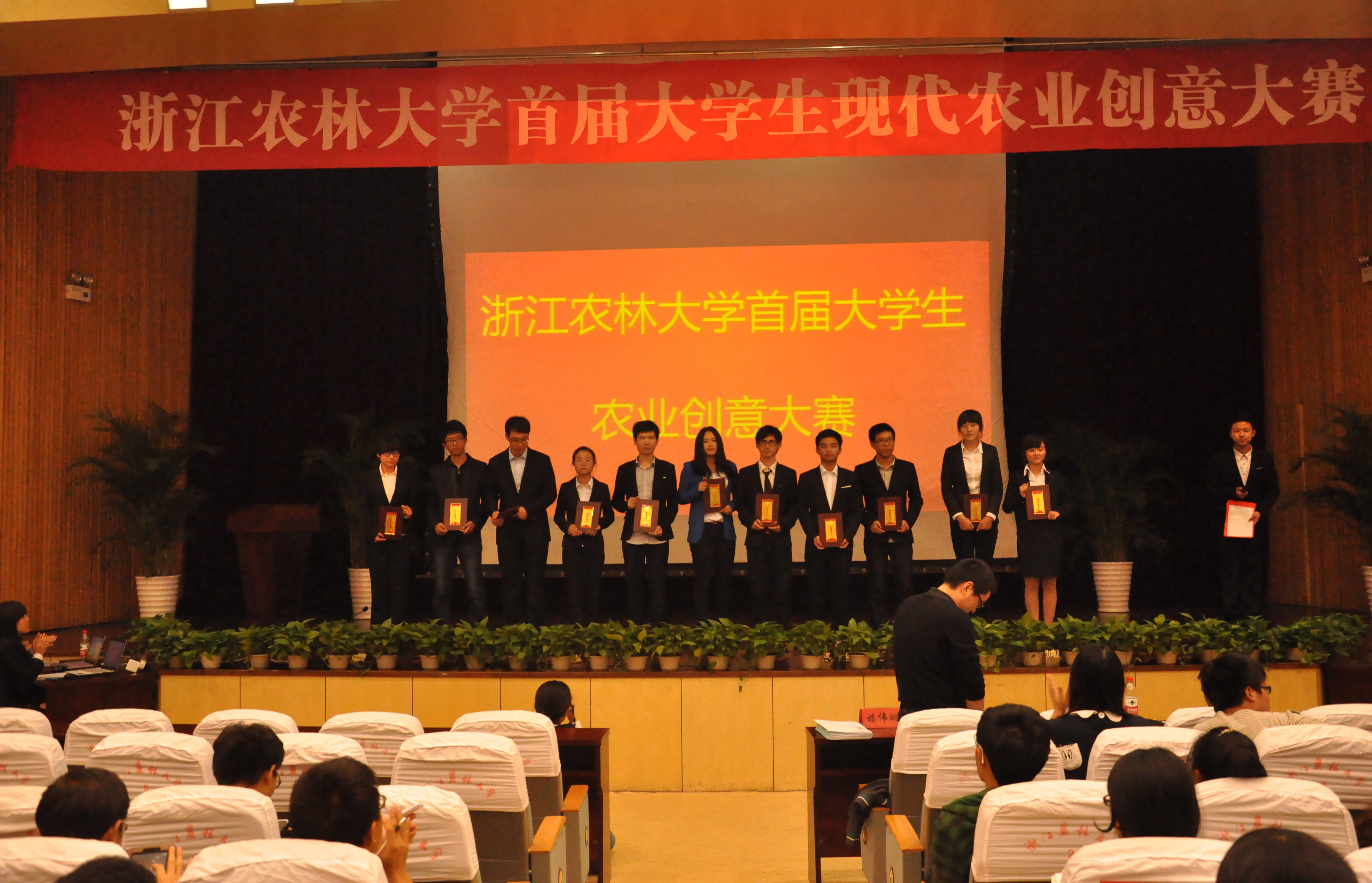 11月9日下午,浙江農林大學首屆大學生現代農業創意大賽決賽在圖書館大報告廳舉行。11支在預賽中突出重圍的優秀團隊參加比賽。校保衛處處長、全球職業規劃師馬小輝,杭州市園林綠化股份有限公司青山湖花園中心經理、臺灣中華花藝研究基金會花藝師孫文博,農學院園藝學科教授賴齊賢,校學生處就業辦主管、全球職業規劃師樓偉琳擔任本次比賽的評委。