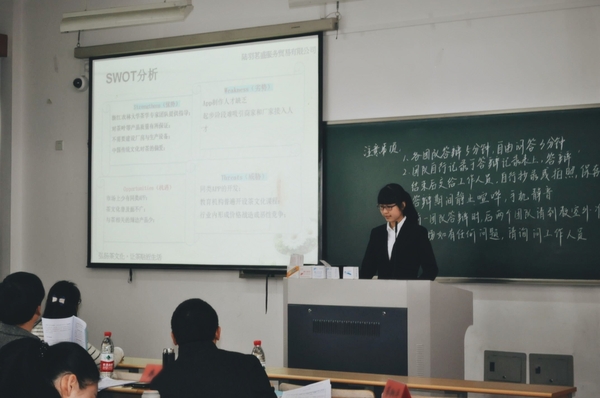 本次復賽答辯分為陳述及自由問答兩部分,每個參賽團隊的時間為8分鐘,其中陳述5分鐘,自由問答3分鐘。經過前期輔導,各參賽團隊在文本寫作和答辯技巧方面都有了很大的提升。匯報席上,項目組成員全方位地展示了其創業方案的技術創新、營銷方案、財務管理等方面的內容,思路清晰,語言流暢;部分創業團隊已實體運營,尤其是淘寶眾籌等運營機制有了全新的突破。在陳述之后,評委結合項目特點,在公司架構、融資方案、運營體系等方面進行了提問,或是針對創業項目中的細節,提出了寶貴的建議。