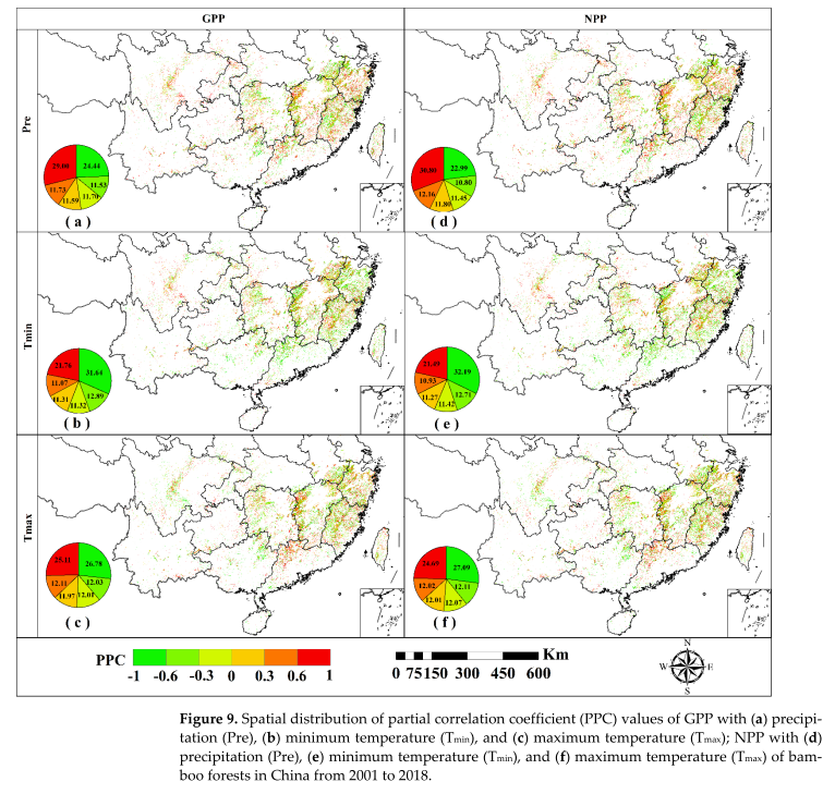 氣候對竹林碳通量時空動態演變影響研究表明,在年尺度上,通過計算竹林GPP、NPP與氣象因子(最高溫、最低溫、降水量)的偏相關系數發現,整體上,竹林GPP、NPP與降水量呈正相關,而與最高溫、最低溫均呈負相關,即高溫或低溫在一定程度上抑制了竹林碳通量的增加,而適宜的降水量促進竹林碳通量的增加。在月尺度上,溫度和降水與竹林GPP、NPP呈顯著相關關系,相關系數均達0.56以上。
