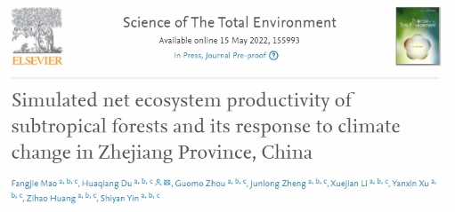 近日,國家重點實驗室森林碳匯研究團隊、全國林業碳匯教師團隊毛方杰副教授為第一作者、杜華強教授為通訊作者撰寫的“Simulated net ecosystem productivity of subtropical forests and its response to climate change in Zhejiang Province, China”論文發表在國際TOP期刊《Science of The Total Environment》(IF=7.963)上,研究得到了國家自然科學基金等項目資助。