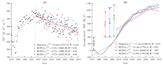 研究表明,從1979年到2015年,浙江省森林生態系統NEP(Net Ecosystem Productivity,凈生態系統生產力)總體呈上升趨勢,年均增加量9.66 g C m-2yr-1,累積NEP為365 Tg C;而2016年到2079年,NEP雖總體呈下降趨勢,但仍大于歷史NEP,同時累積NEP持續增加,至2079年,RCP2.6、RCP4.5和RCP8.5等三種不同情景下累積NEP分別為750 Tg C、866 Tg C和958 Tg C。因此,到2079年,三種氣候情景累積NEP最大可達958 Tg C,是2015年之前累積NEP的2.6倍,說明浙江省森林生態系統碳匯潛力巨大。