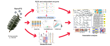 該研究揭示了直徑為100nm的聚苯乙烯納米塑料對香榧幼苗的生理生化和分子水平的反應。納米塑料促進了硫代巴比妥酸反應物質等的積累,誘導了過氧化氫酶和過氧化物酶等抗氧化酶活性。納米塑料影響了香榧光合作用,降低鐵、硫、鋅等元素的體內含量,大量差異代謝物被非靶向代謝組學鑒定。納米塑料的處理對香榧一系列化學和遺傳因子產生重要影響,包括抗氧化劑、小RNA、基因轉錄、蛋白表達和代謝物的積累。多組學聯合分析表明納米塑料在小RNA、轉錄、蛋白和代謝水平影響了香榧萜烯類和類黃酮生物合成途徑。