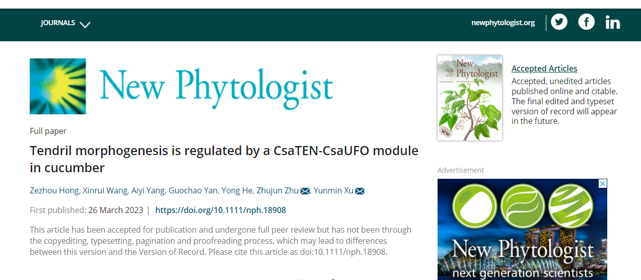 近日,園藝科學(xué)學(xué)院朱祝軍教授團(tuán)隊(duì)(設(shè)施園藝與品質(zhì)調(diào)控團(tuán)隊(duì))在《New Phytologist》(中科院1區(qū),IF=10.323)發(fā)表題為“Tendril morphogenesis is regulated by a CsaTEN-CsaUFO module in cucumber”的研究論文。研究結(jié)果揭示了葫蘆科植物卷須變態(tài)發(fā)育一個(gè)可能的保守基因通路TEN-UFO,促進(jìn)了對(duì)植物攀爬行為進(jìn)化的理解,可為葫蘆科園藝作物(如黃瓜、西瓜、南瓜等)的“無(wú)卷須”育種和輕簡(jiǎn)化栽培提供依據(jù)。