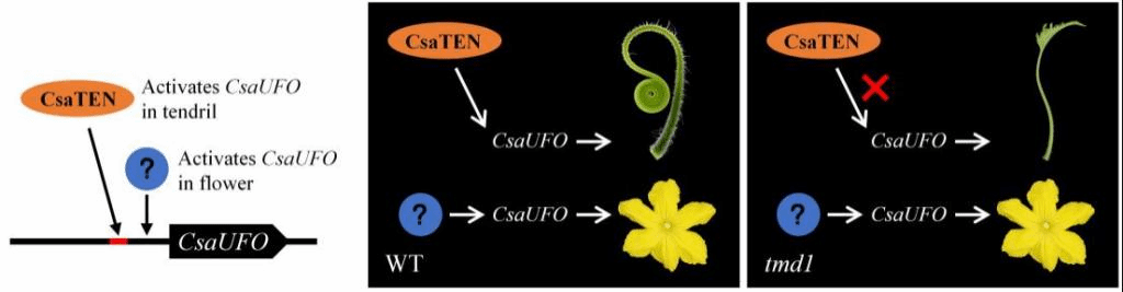 卷須是葫蘆科植物的重要形態(tài)學(xué)標(biāo)記和攀爬器官,通過(guò)卷須攀爬可獲取更加有利的生存條件(光照、空氣)。但是,設(shè)施栽培中,卷須則為多余器官,需要人工摘除以便于藤蔓管理,極大增加了勞動(dòng)力成本。因此,“無(wú)卷須”是實(shí)現(xiàn)輕簡(jiǎn)化栽培的重要育種目標(biāo)。本研究基于一份田間分離獲得的黃瓜卷須缺陷突變體tmd1,主要研究結(jié)果為:(1)正向遺傳學(xué)研究確定候選基因?yàn)?em>UFO,為一份UFO基因啟動(dòng)子功能缺陷突變體。(2)UFO在黃瓜中具有雙重功能,同時(shí)調(diào)控卷須變態(tài)發(fā)育和花變態(tài)發(fā)育,有趣的是UFO上述兩個(gè)功能可以相互獨(dú)立。(3)生化分析發(fā)現(xiàn)TEN-UFO為黃瓜卷須發(fā)育關(guān)鍵通路,TEN結(jié)合UFO啟動(dòng)子并調(diào)控該基因在卷須中表達(dá)。(4)TEN-UFO途徑和卷須器官進(jìn)化形成,可能與UFO啟動(dòng)子中一段保守基序(motif 1)獲得相關(guān),提示其可能應(yīng)用于葫蘆科園藝作物的“無(wú)卷須”基因編輯育種設(shè)計(jì)。