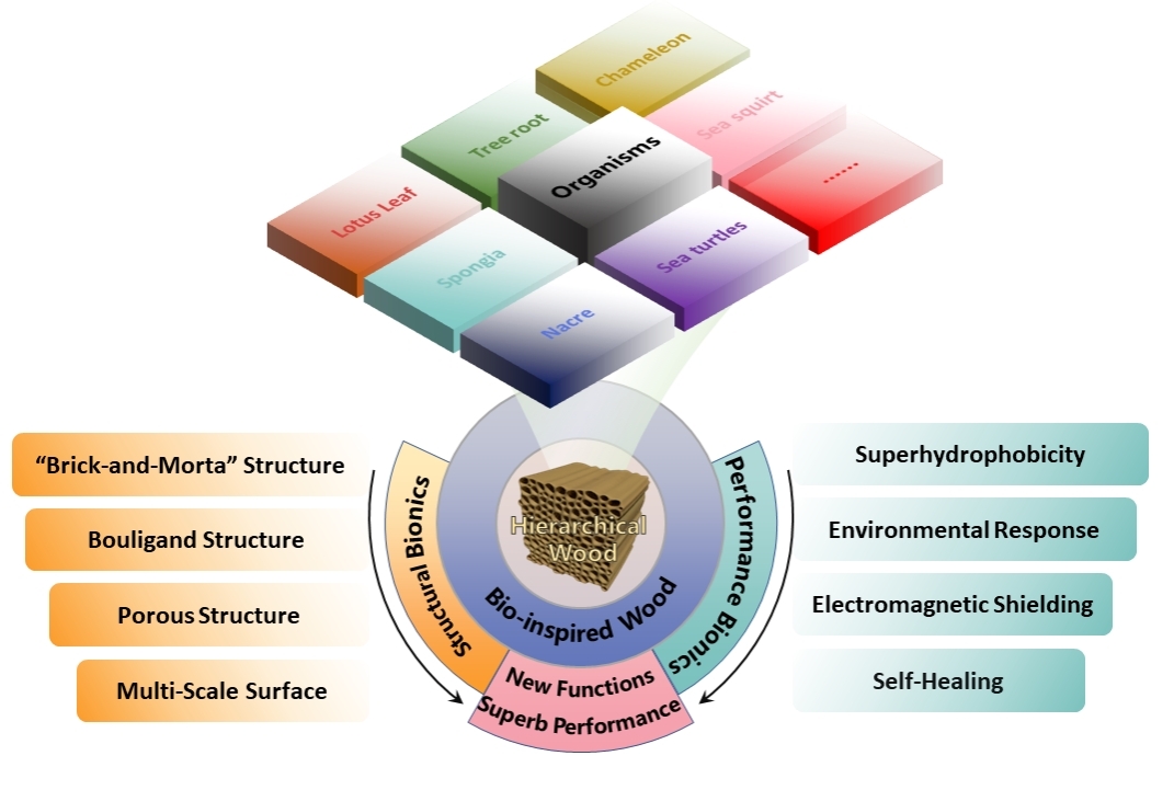 該綜述論文全面總結闡釋了近期在生物仿生木材制品領域的研究進展,通過融合納米技術、分子生物學、界面化學以及物理建模等先進技術,模仿并構筑具有獨特功能的自然生物結構。從生物仿生的視角出發,深入解構自然現象和生物結構,探究組成和結構設計原理、構效機制和重構策略,建立木基生物仿生功能/智能材料的理論和技術基礎。通過借鑒自然界和木材中固有智能行為和獨特結構的啟示,探討了用于加工仿生木材復合材料的技術手段,旨在實現木材的自增值(如超疏水木材、分級結構木材、磁性木材)、自修復、自學習(如氣凝膠型木材)以及環境適應性(如熱響應、光響應、pH響應木材等)。木材仿生智能科學為多種木材加工技術提供了全新的理念、設計方法和組合途徑,通過化學處理、物理加工以及生物加工,賦予木材全新的功能和智能響應能力。