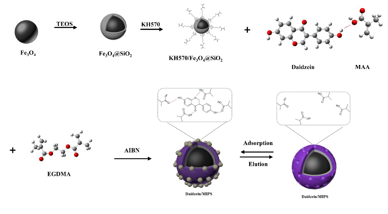 楊勝祥團(tuán)隊(duì)采用密度泛函理論對(duì)載體構(gòu)建和提取分離過程進(jìn)行模擬計(jì)算,并根據(jù)計(jì)算結(jié)果優(yōu)化實(shí)驗(yàn)條件,在修飾改性后的磁性Fe3O4納米粒子表面進(jìn)行聚合印跡,制備得到了一種磁性表面分子印記聚合物,實(shí)現(xiàn)了對(duì)大豆素的靶向識(shí)別和高效提取,為復(fù)雜成分中高價(jià)值活性化合物的快速定向分離提供了參考。