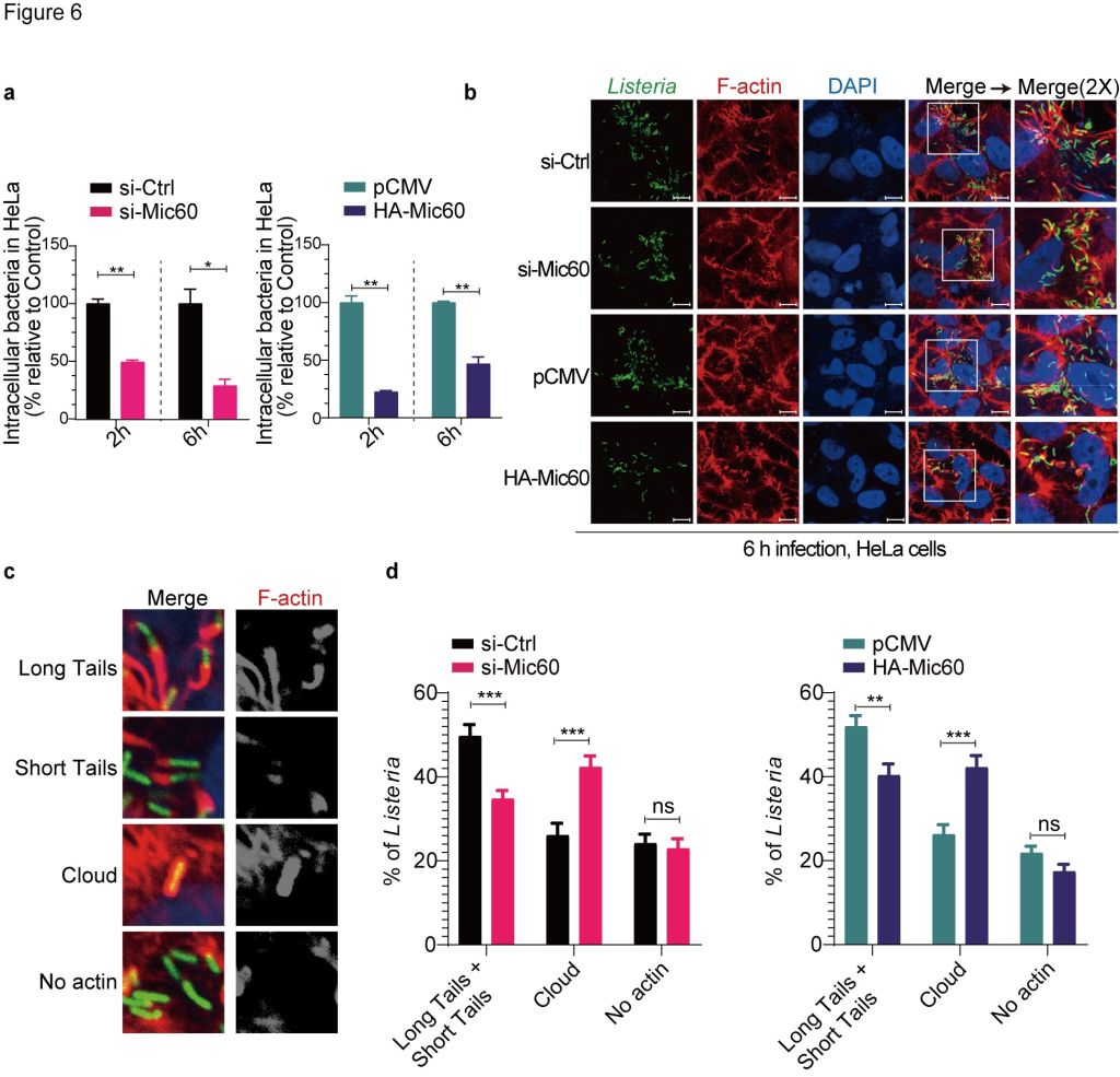 該研究聚焦重要人獸共患胞內病原菌——單增李斯特菌,系統探索了病原在感染過程中與宿主線粒體的調控關系,首次揭示了細菌重要毒力因子與線粒體接觸位點和嵴組織系統(MICOS)復合物的互作分子機制。