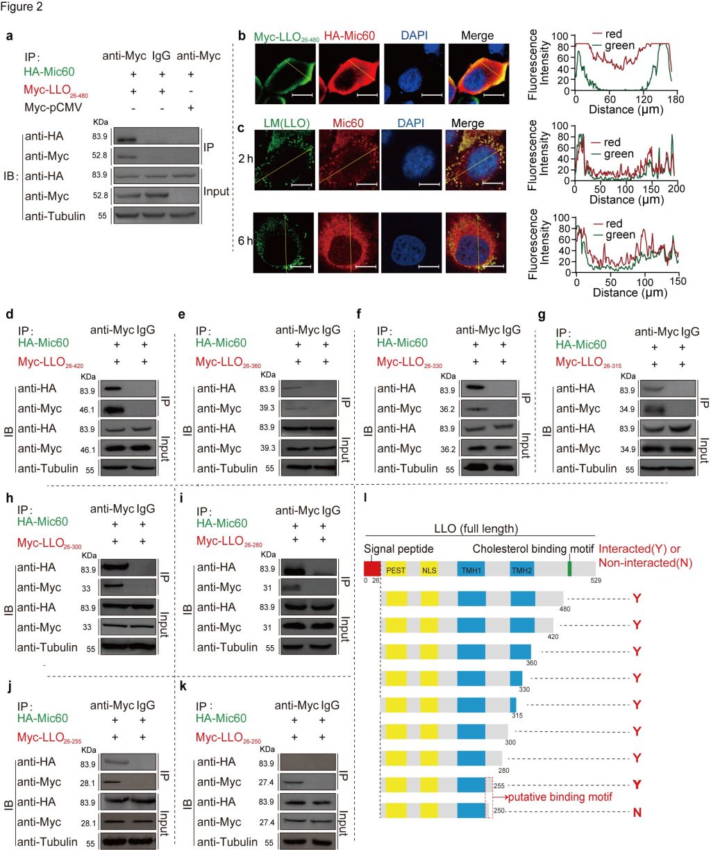 論文主要發現之一:單增李斯特菌毒力因子溶血素LLO與宿主線粒體膜結構蛋白Mic60的互作關鍵結構域和氨基酸位點