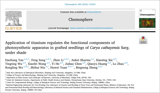 近日,國(guó)家重點(diǎn)實(shí)驗(yàn)室林木栽培生理研究團(tuán)隊(duì)在國(guó)際知名期刊《Chemosphere》(IF=7.086)發(fā)表了題為“Application of titanium regulates the functional components of photosynthetic apparatus in grafted seedlings ofCarya cathayensis Sarg. under shade”的研究論文。該研究在光合作用層面解析了山核桃響應(yīng)遮蔭脅迫的生理機(jī)制以及抗水解穩(wěn)定離子鈦緩解脅迫的生理機(jī)制,為促進(jìn)山核桃在遮蔭條件下的生長(zhǎng)奠定了理論基礎(chǔ)。