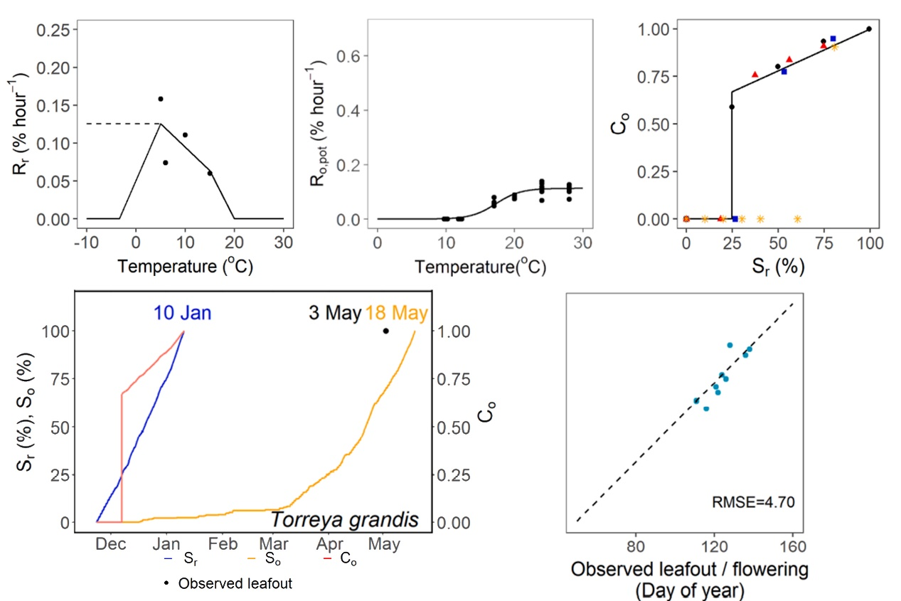 該研究在國際上首次揭示香榧等四個亞熱帶經濟樹種生理和生態休眠過程對氣溫響應規律,在此基礎上提出構建氣溫驅動模型的基本框架:休眠解除速率(Rr)和個體發育速率(Ro),并引入個體發育能力(Co)的概念用于闡述休眠解除狀態和氣溫對個體發育的交互效應,成功構建了適用于亞熱帶樹種的春季物候模型。該模型可以清晰顯示氣溫驅動物候變化的生理生態過程,揭示不同樹種的休眠動力學差異,極大地提升了春季物候模型預測的真實度。