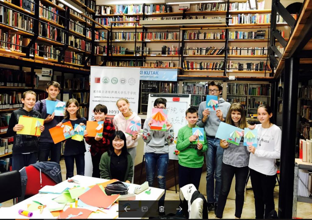 “學茶禮·敬先賢”系列活動在卡爾洛芙茲語言高中(KarlovciGrammer School)舉行,學生們品讀儒家經典《論語》,加深了解先賢孔子,并學習以茶敬師的禮儀;名曲《長江之歌》、《月亮代表我的心》等在漢語興趣班廣為誦讀傳唱。孔院還收到了來自各教學點的禮物,其中最具特色的是孔子課堂申請學校卡爾洛芙茲語言高中的剪紙,由師生共同創作完成的一幅長達十米的“手拉手”剪紙作品,象征著中塞關系的親密友好和天下孔院一家親。