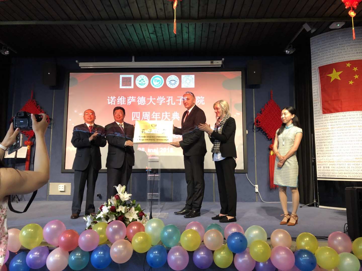 當地時間5月26日,恰逢諾維薩德大學孔子學院四周年院慶,國家漢辦歐洲處處長楊金成到諾大孔院視察工作,并親自將“孔子課堂”銅牌鄭重授予諾大孔院下設教學點卡洛爾芙茲語言高中(Karlovci Grammar School),宣告諾大孔院首個“孔子課堂”成立。